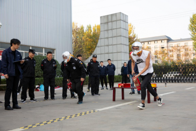 保衛(wèi)部微型消防站隊(duì)員需完成原地著消防防護(hù)服、佩戴自救呼吸器30米滅火、一人兩盤水帶連接操。原地著防護(hù)服,隊(duì)員在聽到“開始”口令后迅速穿戴防護(hù)服、消防靴、消防頭盔、扎安全腰帶。佩戴自救呼吸器,在起點(diǎn)處完成空氣呼吸器的佩戴,隨即提起4kg干粉滅火器快速到達(dá)距離30米處的指定區(qū)域進(jìn)行滅火。一人兩盤水帶連接操,隊(duì)員迅速甩開***盤水帶,一端接到消火栓接口,另一端接到第二盤水帶,在行進(jìn)中接上水槍到達(dá)終點(diǎn),完成比賽。